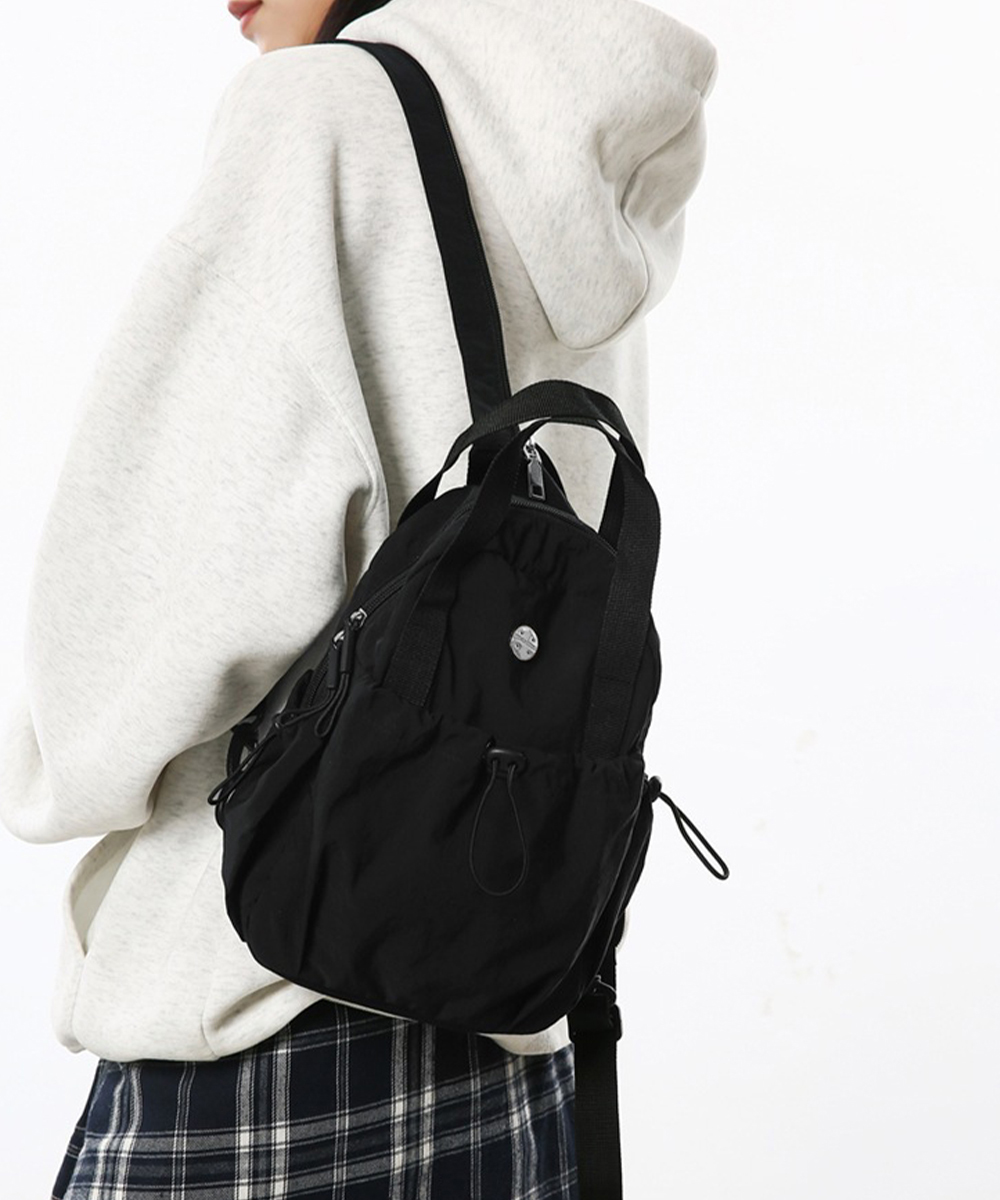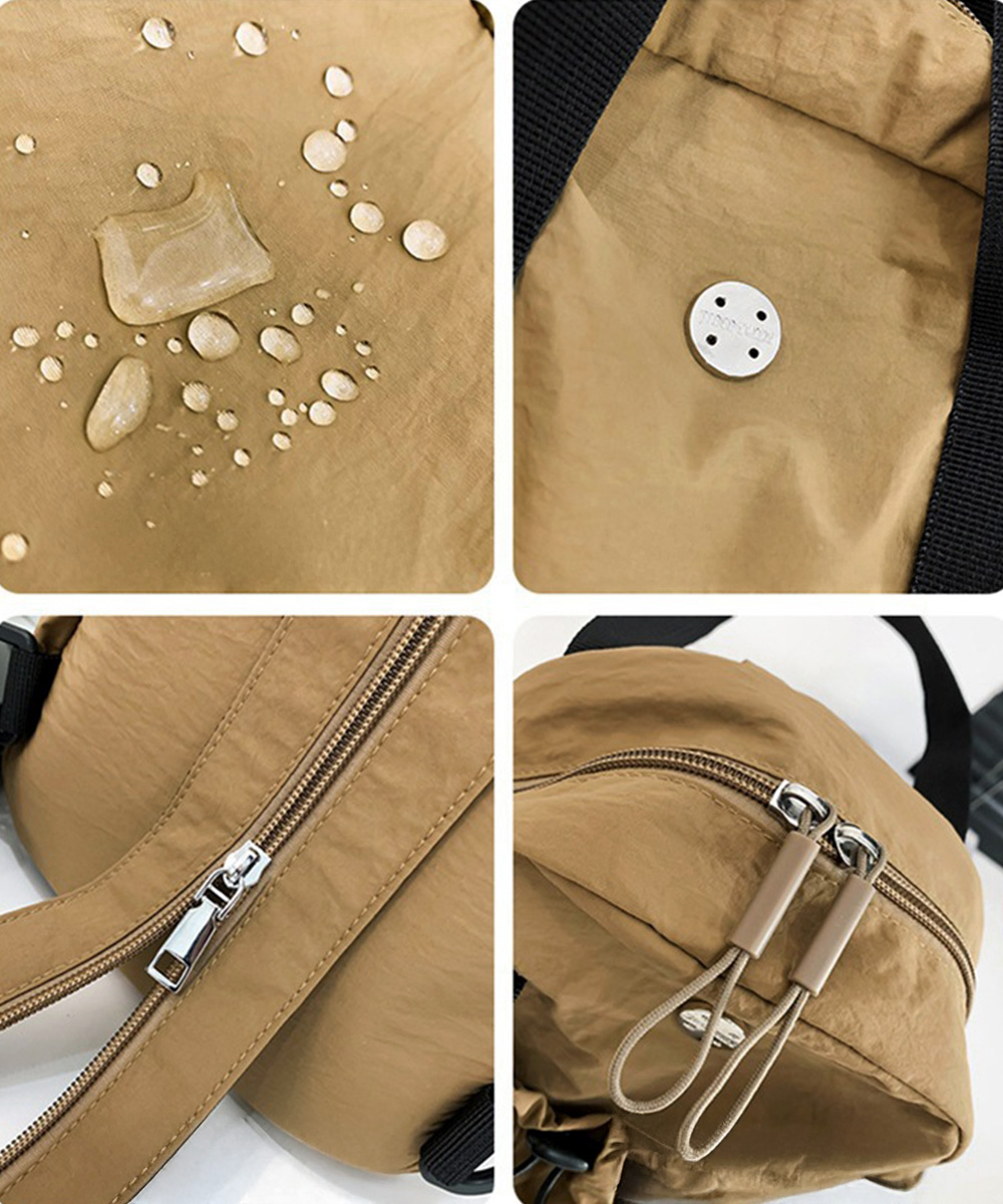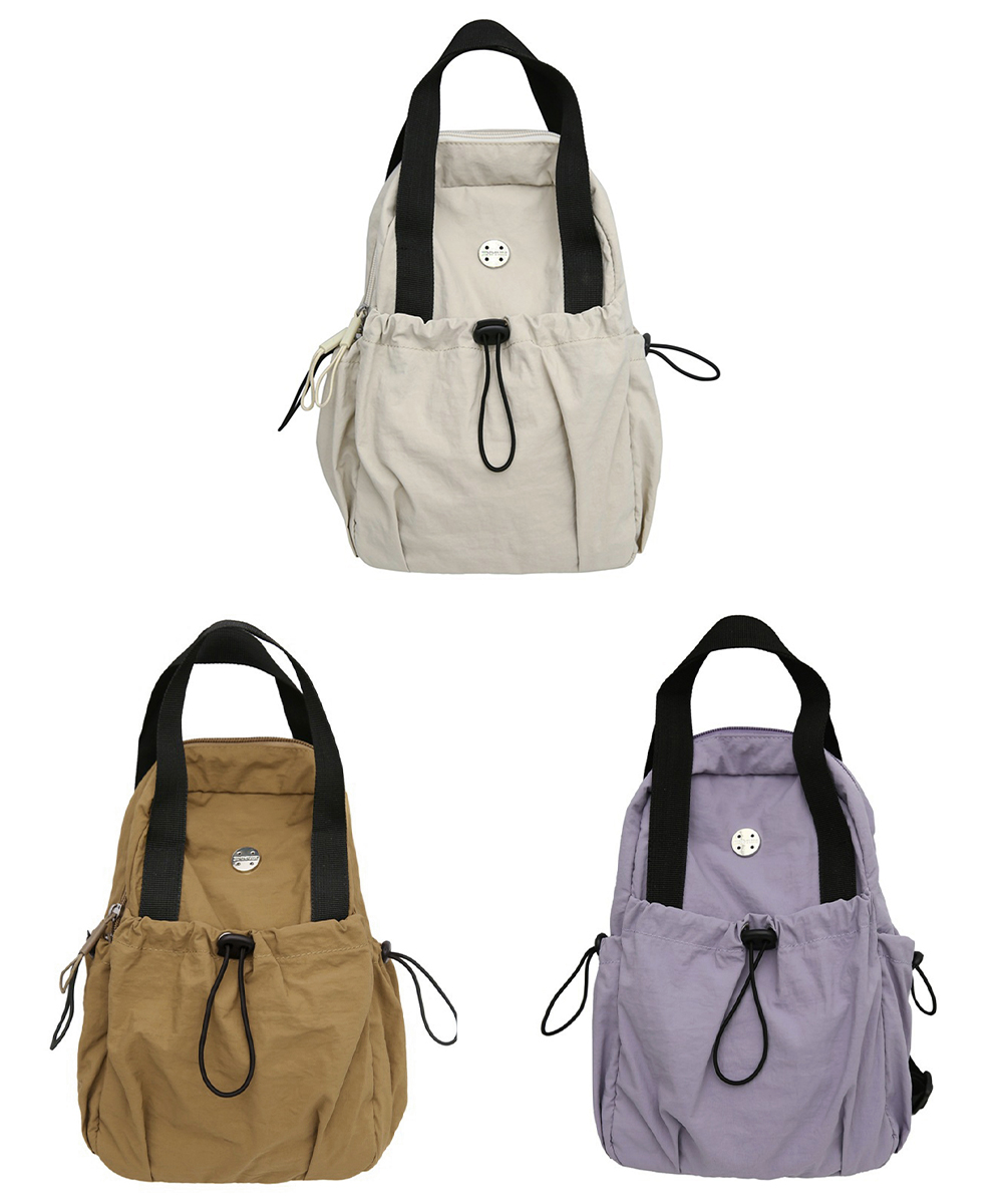 軽くて持ちやすい、ナイロン素材の2WAYミニリュック。 撥水仕様で汚れが付きにくく、急な雨の日も安心。 メイン収納はダブルファスナー仕様で、開閉もスムーズ。 外ポケット+ドロスト(ギャザー)デザインで、小物の出し入れがしやすい。