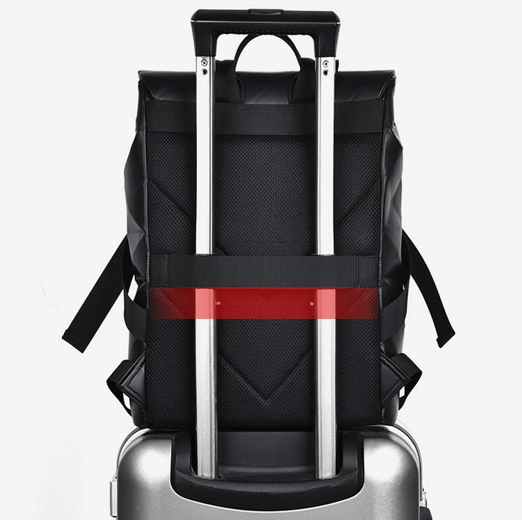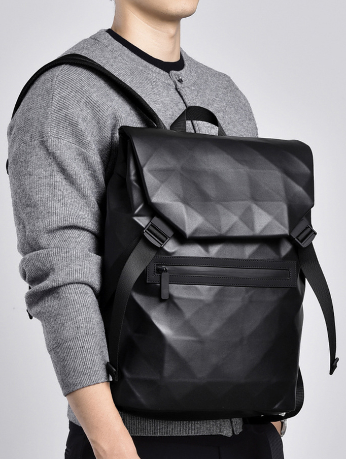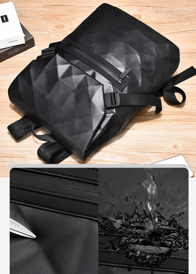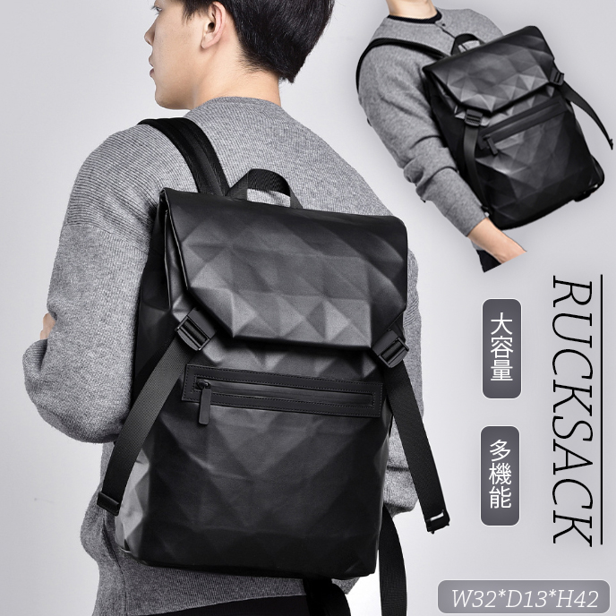 スタイリッシュな幾何学模様が特徴的な大容量防水リュックサック。