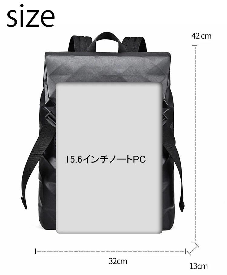 ・プライベートでも使える、ビジネスでも使えるバックパック。 ・背中に当たる部分はメッシュ素材で通気性抜群。 ・防水仕様のため、雨の日も安心してお使いいただけます。 ■サイズ(約cm) 横32×マチ13×高さ42CM ■素材 PU、ポリエステル ■裏地 あり ■内ポケット あり
