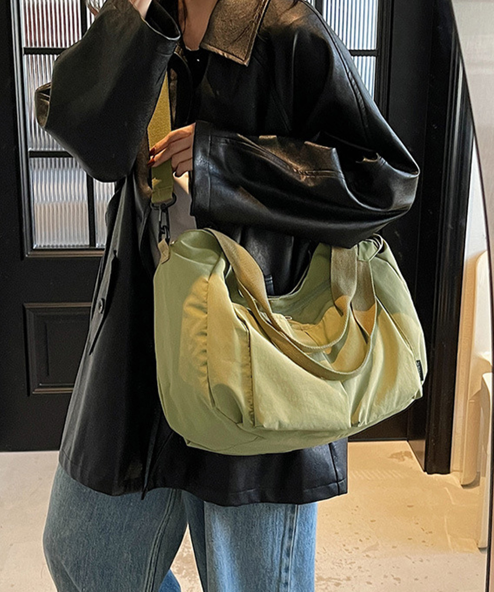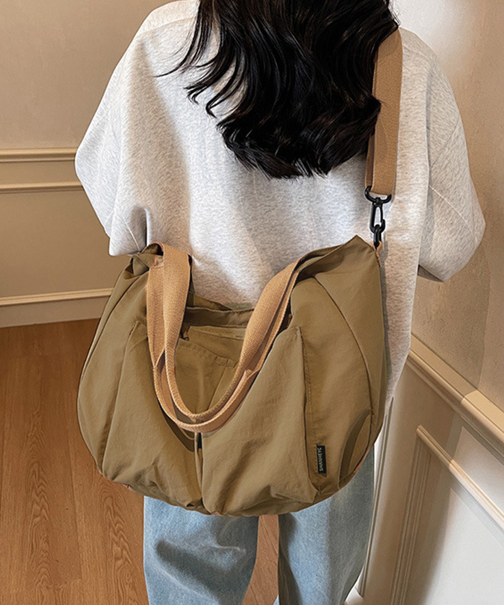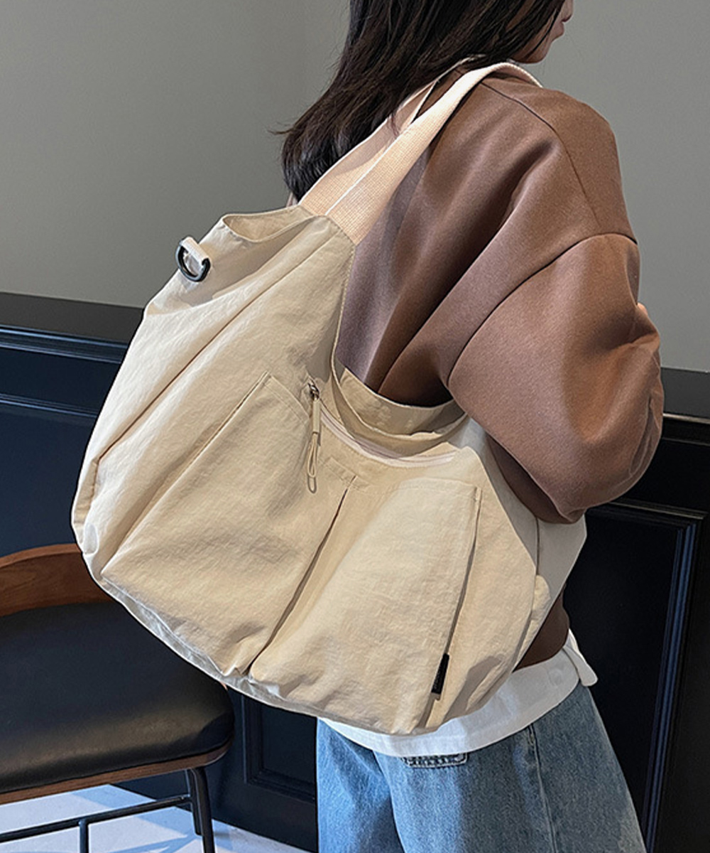 収納力に優れた大容量デザインが魅力の、ナイロン素材ショルダーバッグ。 複数ポケットとファスナー仕様で中身を整理しやすく、デイリー使いに便利。