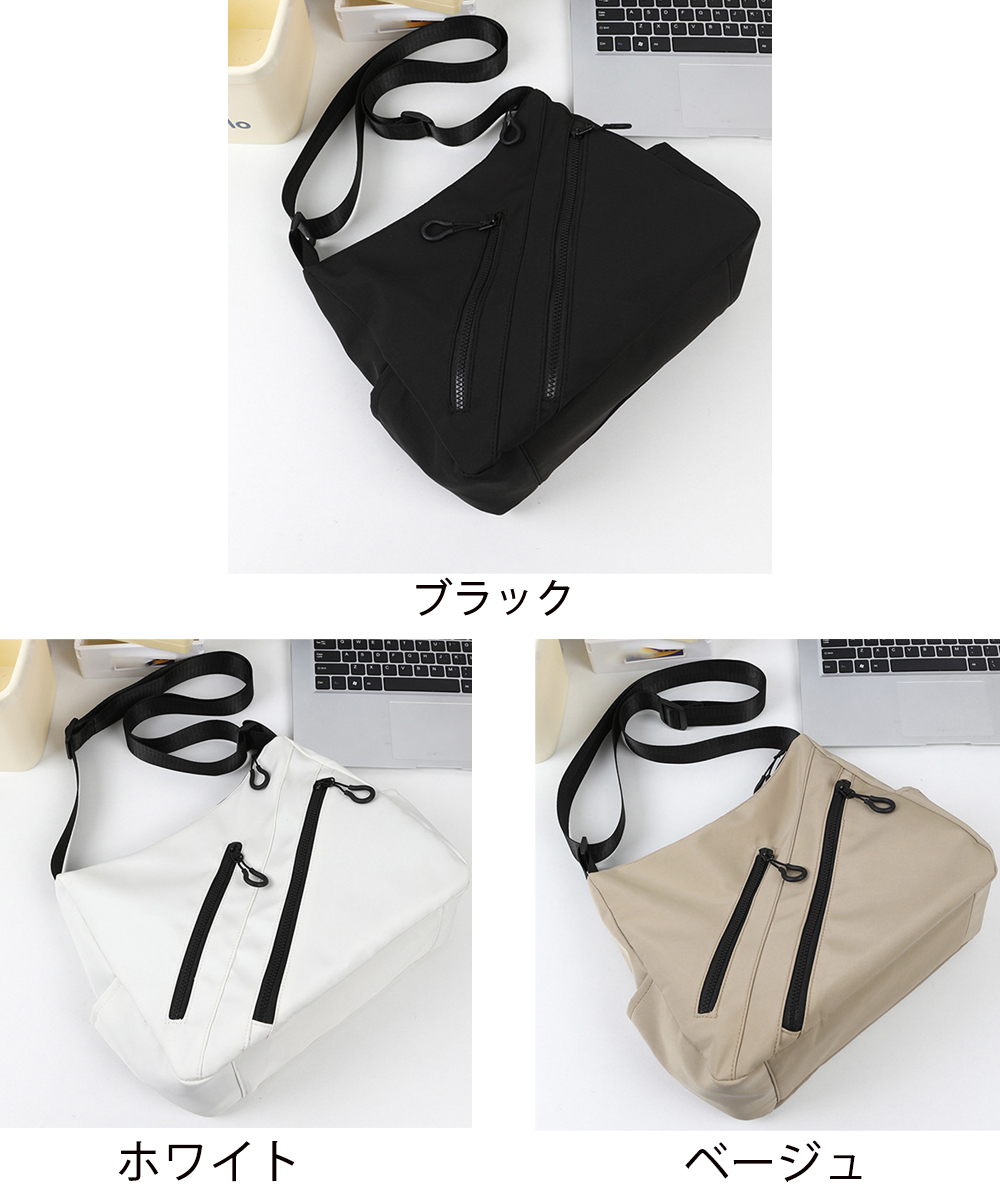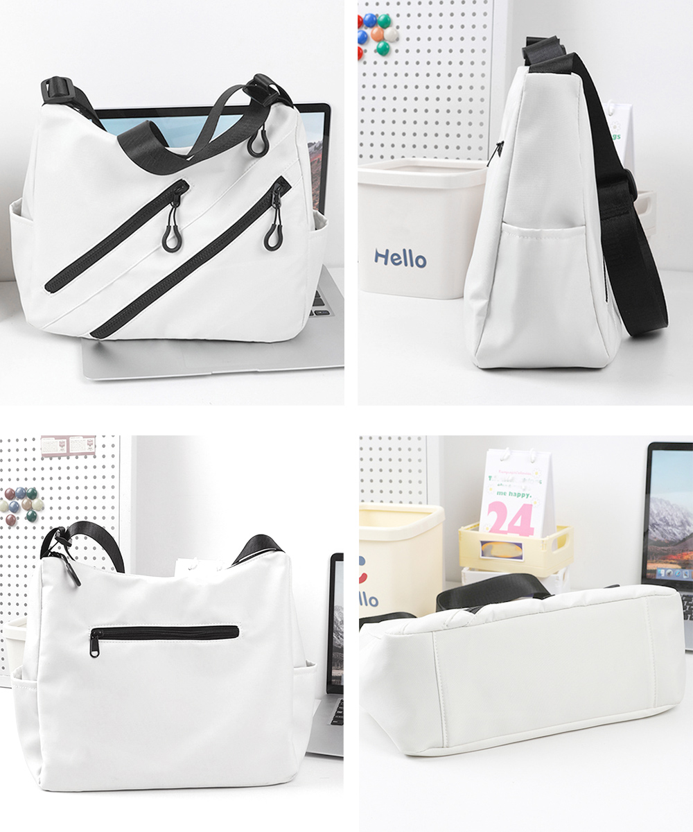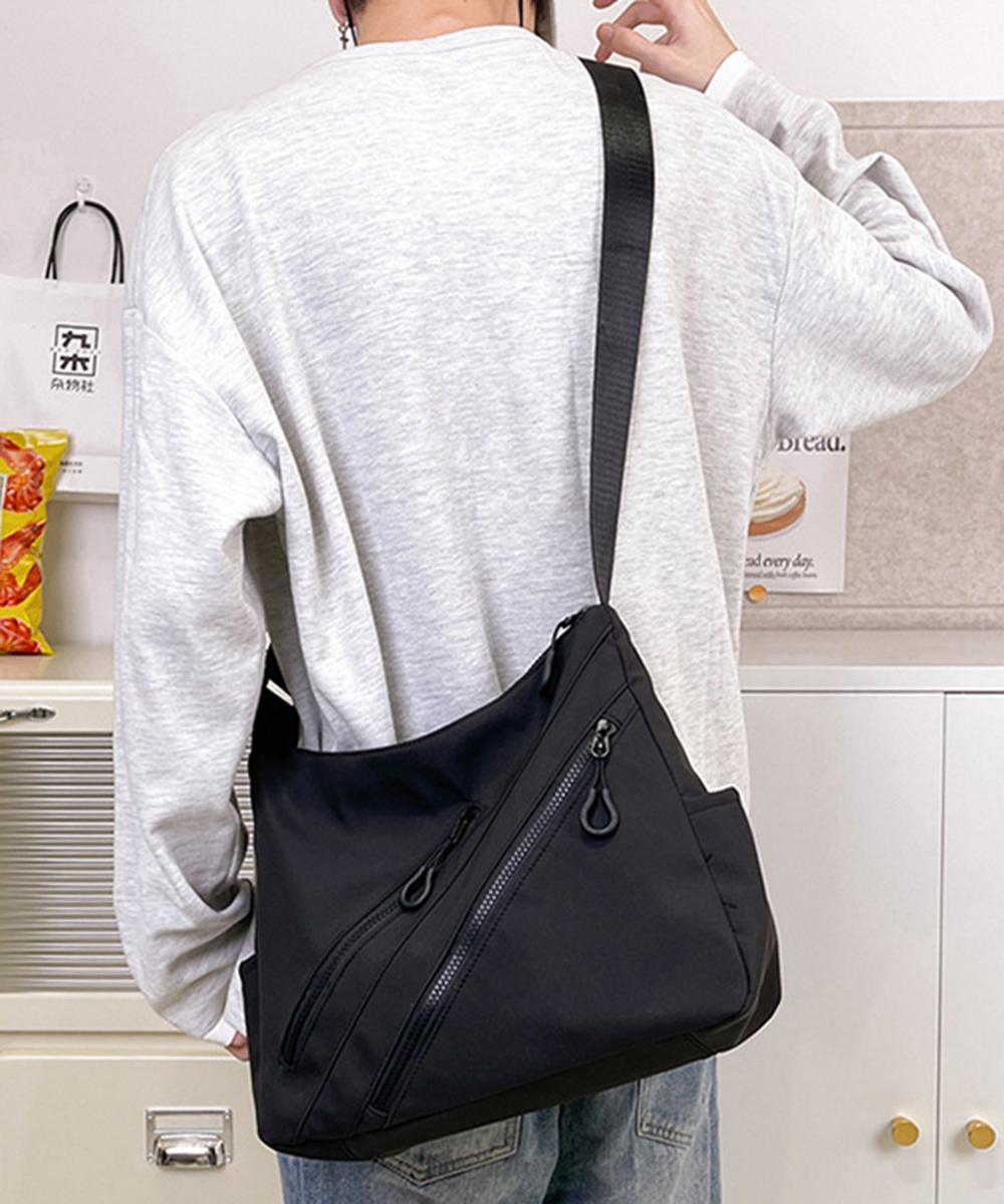 軽量で丈夫なナイロン素材を使用した男女兼用ショルダーバッグ。 長さ調節可能なベルトで肩掛け・斜めがけの二通り仕様が可能。 ジムバッグとしても通勤通学にも最適な多収納設計。