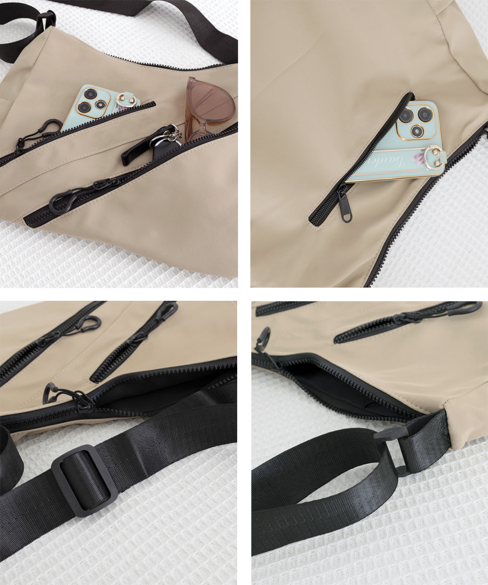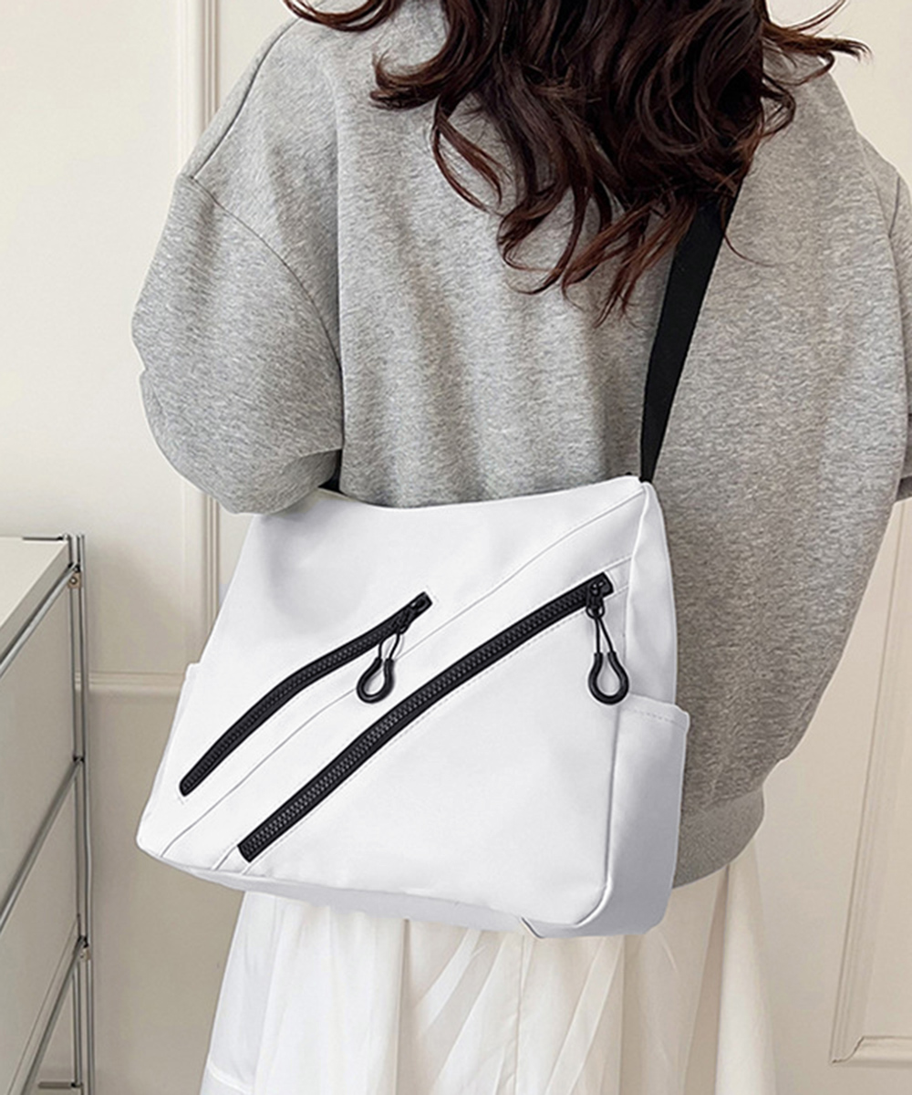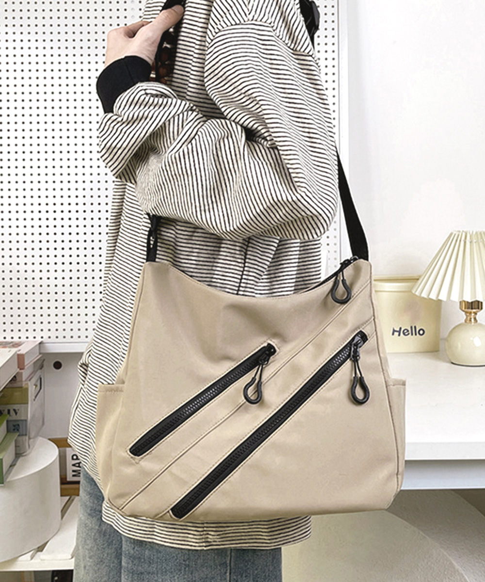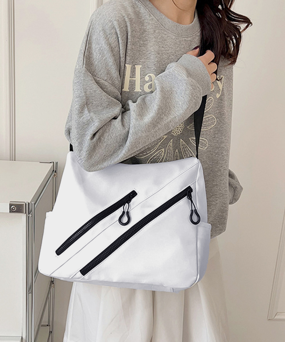 軽量で丈夫なナイロン素材を使用した男女兼用ショルダーバッグ。 長さ調節可能なベルトで肩掛け・斜めがけの二通り仕様が可能。 ジムバッグとしても通勤通学にも最適な多収納設計。