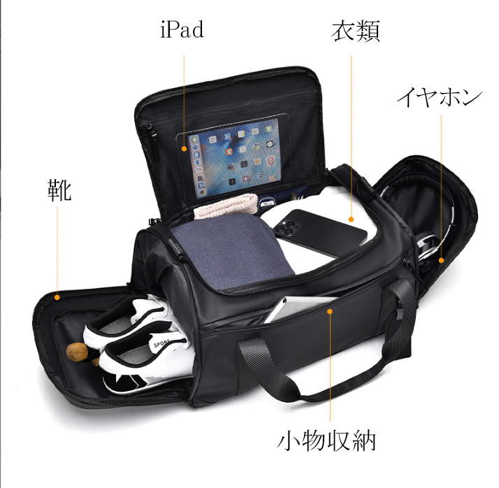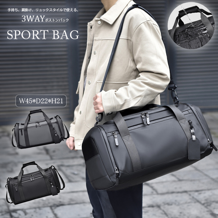 ・手持ち、肩掛け、リュックスタイルで使える、3wayボストンバック。 ・ニーズにあわせてショルダーバッグ、ハンドバッグ、斜め掛けバッグと色々な形を楽しむことができます。 ・濡れた衣類や折り畳み傘など、収納することができる防水仕様のポケットがあります。 ・底面に靴が収まる専用のファスナー付きポケットあります。 ・多ポケットで小物を分けて収納することができます。